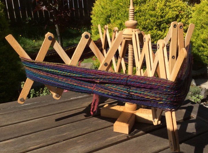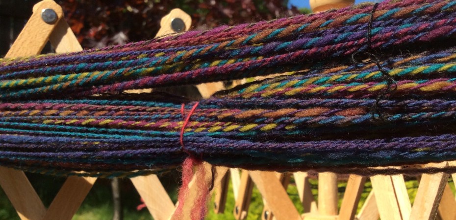 Thanks to YouTube and Knittingthestash blog I knew roughly what to do and have now steamed my spun yarn and it’s drying in the gorgeous weather we are having in the Highlands (for a change).