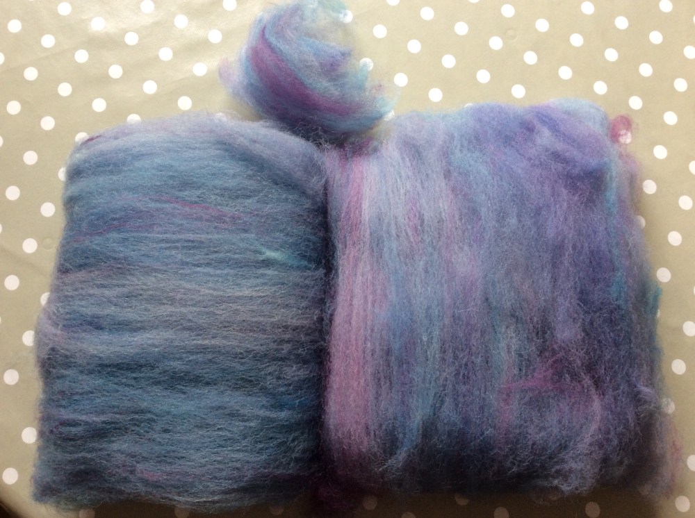 The results are these 2 lovely batts (plus some scraps stuck on one of the drums).  I will post an update when its spun, but so far I LOVE the colours.  I am going to a 3 day music festival on Thursday but for sure I will be playing around with the drum carder at the start of the week.