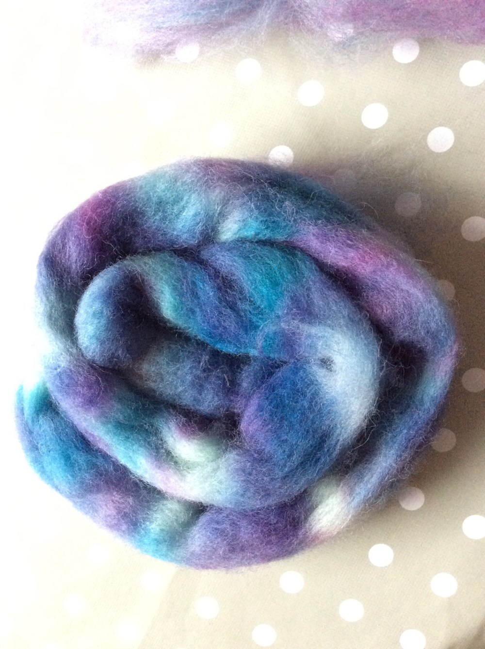 Despite the heat I really enjoyed the process of playing around with some of the dyes.  I already had a hot pink but combined with the Opal coloured landscape dye made a lovely purple.  This time rather than adding knots I made a crochet chain of fibre and plopped the dyes on randomly…when the dye was almost exhausted in the pan I undid the chain so the white parts could pick up the last traces of the turquoise.