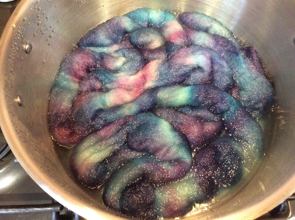 So what did I choose to practice on the hottest day of the year??? Dyeing fibre! Yep a steaming hot pan of fibre and dye on a summers day!