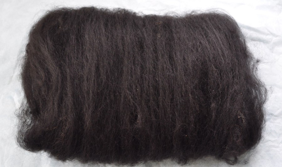 I also drum carded this black fibre, I picked up in a stash with my spinning wheel. I am not 100% sure what it is, given the lack of grease, the amount of dust/vm and the softness, I think it is alpaca. The staple length varies but is mostly pretty long with odd short fat curls, which could be from its head? I am not an expert in fibres, but alpaca is my best guess. This photo is only a small part, there’s actually 119g of it now carded….similar amount to the white Samoyed…so I could try a humbug inspired ply (does the US have humbug sweets/candy!?!?!) Or I could knit something with black and white stripes?!