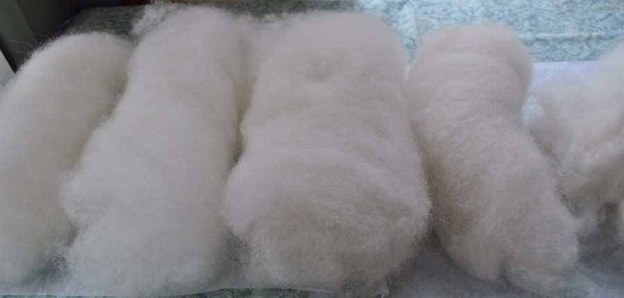 The first half of the Samoyed dog hair has now been washed numerous times and drum carded and comes to 118g (4.16 oz). The other half has been washed and has been drying most of the week, so I will card it next week. There is still a whiff of dog about it, but once spun it will need washing again and hopefully that will work. I started pulling guard hairs out, but lost the will, perhaps as I spin I will try to pull out any very thick ones.
