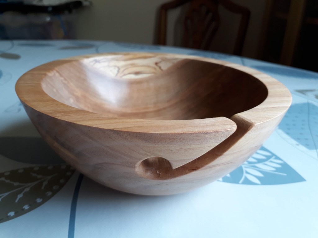 I can’t remember another birthday present I have enjoyed as much as my wood turning course. I suspect I’ll be asking for another one next year. I said to Andy, my instructor, that the last thing I needed was another hobby that needed lots of gear, as my knitting, spinning, weaving and felting stuff is already filling the house…if I took over the garage with turning tools that would be a step too far. But I did enjoy it so much. Great fun and really happy with my finished yarn bowl.