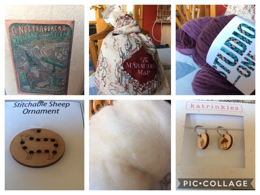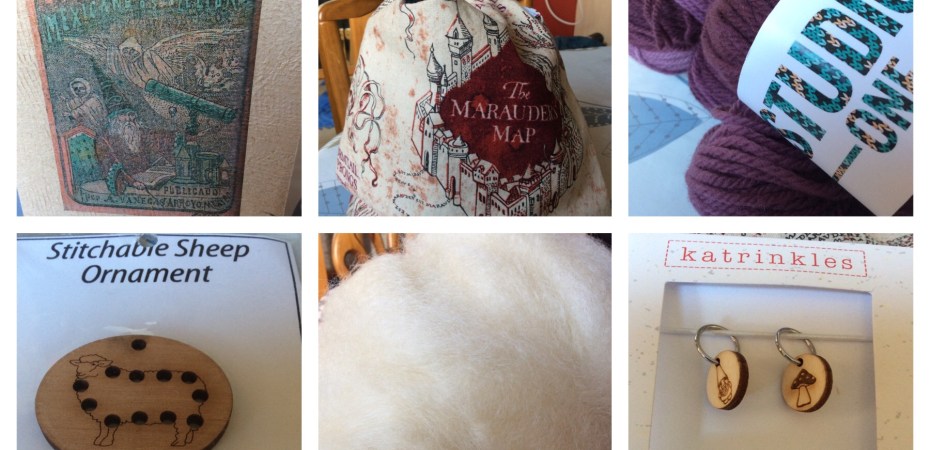 • A project bag with Harry Potter themed fabric on the inside and another on the outside, beautifully sewn by Alissa using a design Sarah at Mildly Granola blog had made Alissa in the past.  Perhaps I might give the books or movies another try.