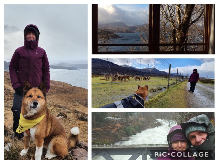 For our anniversary trip (last weekend) we stayed 3 nights at Down House in Diabaig, Torridon. I’ve included in the collage a picture of the view from our bed (which is also the view from the dining table and sofa too). There was lots of rain, no TV, I unplugged from social media and emails for 4 days and didn’t do any knitting! We ate lots, played Monopoly over 3 evenings and enjoyed watching the clouds passing and the birds on the bird feeders; visiting some deer and spotting wild ones too and seeing lots of Highland coos (the furry cows with big horns). It was a lovely weekend and we were so relieved to find 3 places to eat that were not only open but let us in with our dog (Lots of places are closed until Easter). In case anyone is reading this who is visiting the area, the 3 places were The Torridon Inn, Loch Torridon Community Centre’s cafe and the Applecross Walled Garden Cafe.