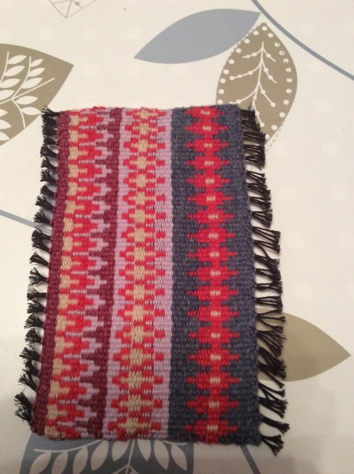 I cut the Krokbragd sample off the loom, it is an odd shape to know what to do with, maybe just an oblong coaster.  I had thought about trying some other things using up the remaining warp before cutting, but the pull in (how much it has shrunk in on each side) was quite tight, so I want to re-thread the cut warp through a wider reed and then use the rug yarn I’d bought.  (I have given my new reeds a coat of the teak oil as well.)