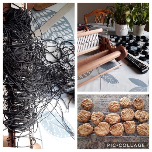 Here’s what happened when I tried to remove some warp threads!  3 hours it took to untangle!  I ended up having to remove them all.  This was on Friday, when I also made a batch of totally delicious sultana cookies….I ate 9!!!!  9!!!! Needless to say I didn’t need any dinner.  (I have provided the link, but will deny any responsibility for anyone else’s weight gain if you try this recipe. 😋)