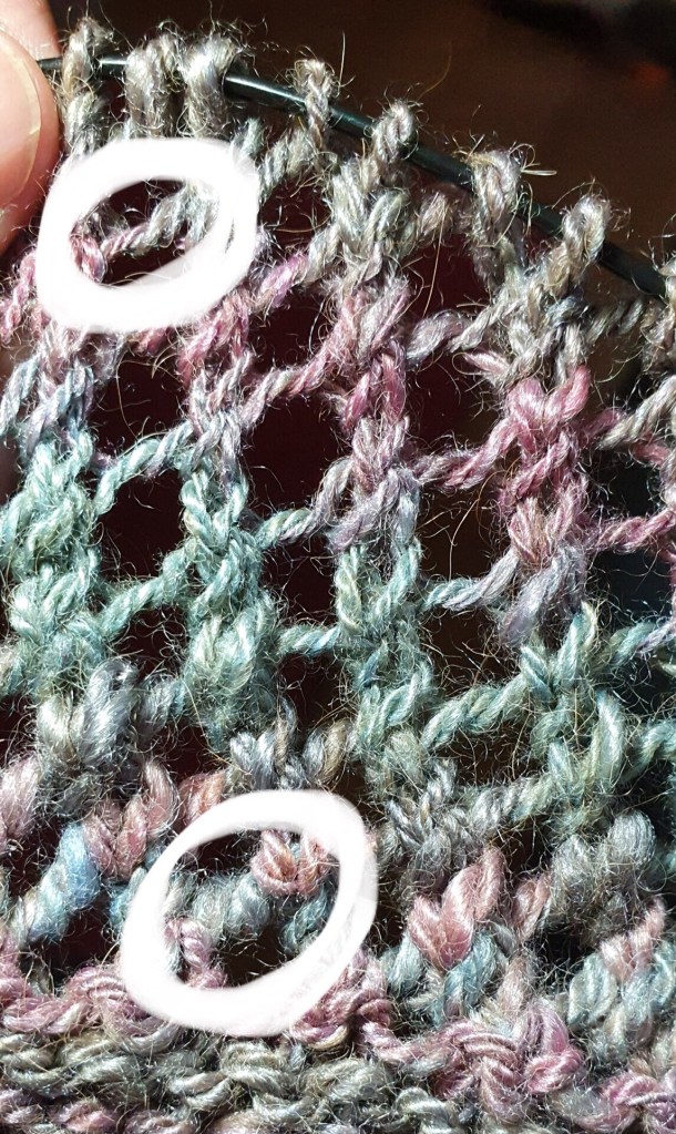 The inconsistency of this homespun yarn is pretty obvious whilst I am knitting it; some areas it’s lace weight and others almost chunky! Look at the 2 circled areas below!! This is what happens when you work on a spinning project and don’t make notes or sample cards and that project goes on for 12 months!
