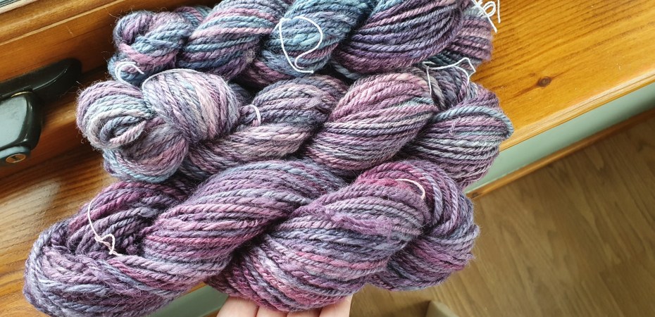 Whilst I was wet setting the Samoyed yarn I thought I’d finally get around to setting the 3 yarns I spun last October during BritSpin. The wet wool smell helped to mask the wet dog smell. Considering how many times I have washed the dog fibre and now the yarn, even with dog shampoo, there just is no getting away from the dog smell. It makes me realise my own house must absolutely whiff of our dog.