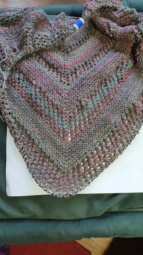 I started spinning it at last year’s Tour de Fleece (TDF) and the 3rd skein for it was spun recently during this year’s TDF! Hopefully with it having 50% silk it won’t struggle to hold its own weight at the points where it is like lace. I do still have more of this fibre to spin, so I could go bigger than the pattern suggests, or do a fancy bind off edge, we shall see. It should definitely be finished this week.