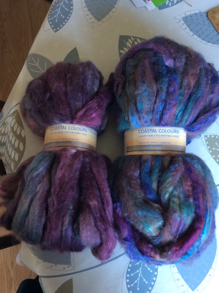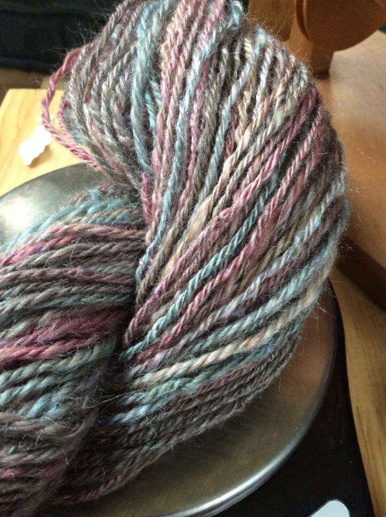 I enjoyed spinning the baby camel so much I picked out another combed top and spun it all, this time it’s purples. It was the one on the left, I wish I’d taken a better photo. The colours aren’t quite right on the fibre or the finished yarns.