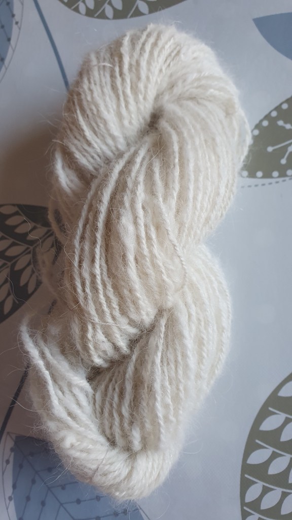 - Spinning dog fibre : aka Spinnin’ Chien. This is a group I joined in September 2018, when I was given some Samoyed dog fibre by my neighbour. Her parents owned the dog and wondered if I’d spin it. I’m embarrassed to say that it took me nearly 2 years to get round to doing the spinning and the dog died in February 2020. This was my first time spinning in their team. I also won a prize in this team as well! A chance to select a pattern on Ravelry which will be gifted to me. I have chosen the Havana Afghan CAL pattern, which is on my YOP list and I’ve been thinking of making a mini version as a lap blanket. I’ve also seen one lady use the chart from it as a knitting pattern to make a scarf as well.