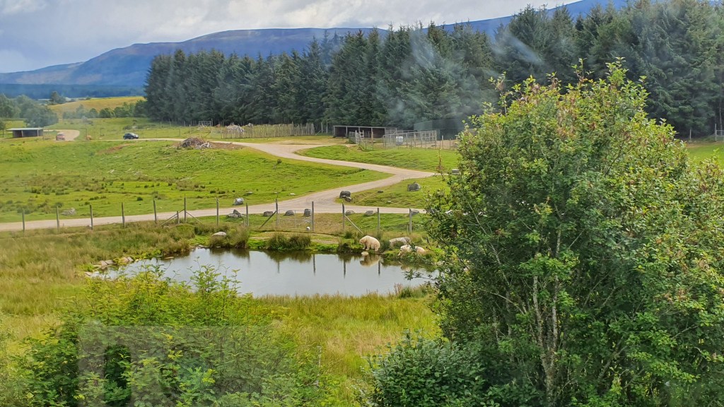 Steph and I had a great day at Highland Wildlife Park on Monday. In typical Scottish summertime I started the day with my padded coat, hat, shawl and gloves and raincoat as it was a chilly start, then lunchtime brought rain and by the afternoon it was warm enough to take off some layers. Can you spot the 2 adult male polar bears considering a swim?