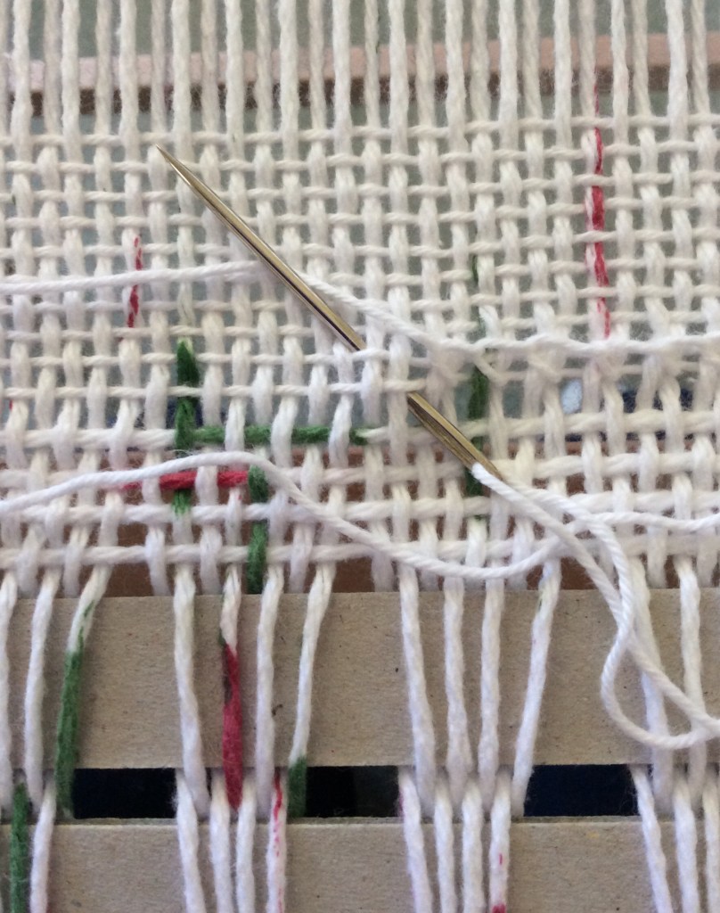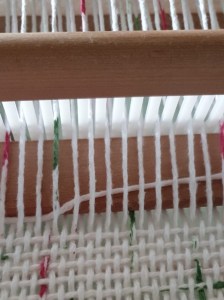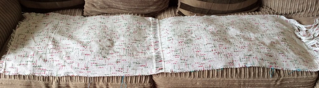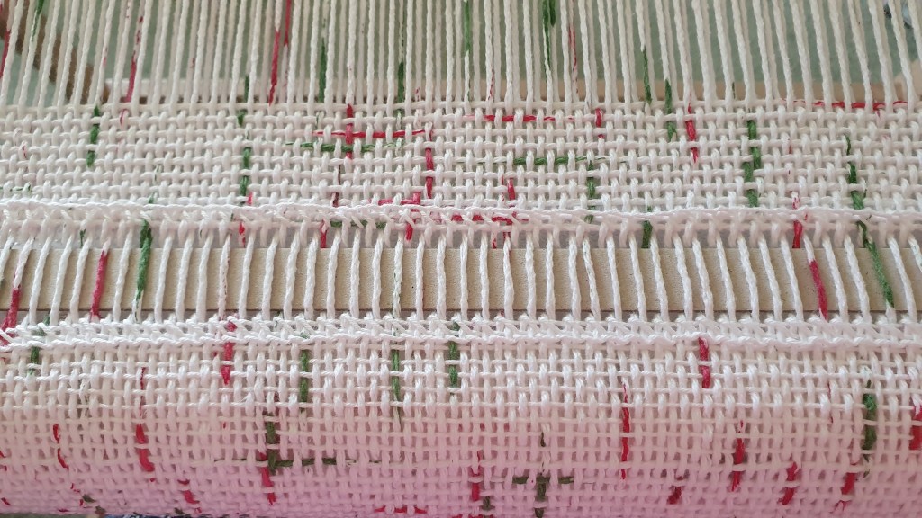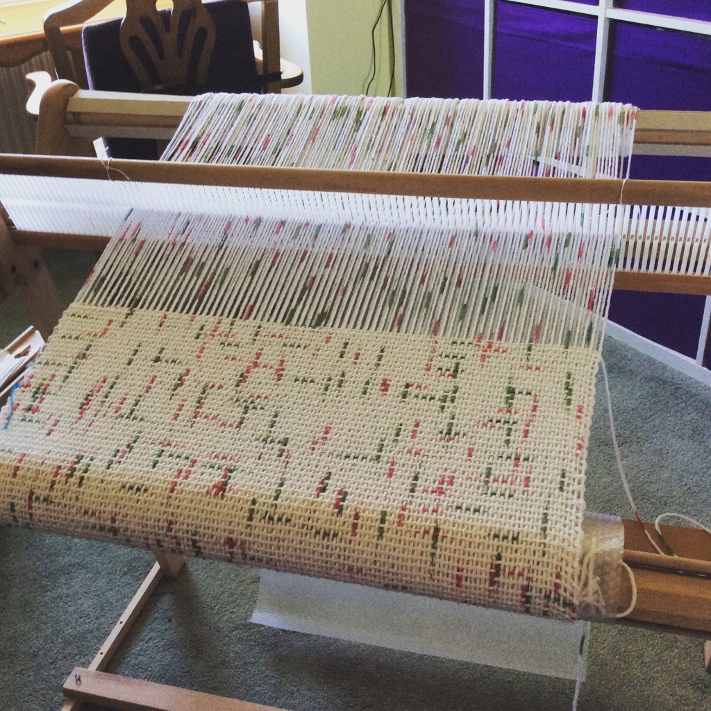 My new (to me) Ashford 32″/80cm Rigid Heddle Loom and stand arrived on Wednesday afternoon. It had been packed and labelled really well to make it easier to assemble. By Thursday morning it was all set up and ready to warp. I warped it with Sugar’n Cream worsted weight cotton in Holly Jolly colour. For the weavers amongst you here’s the details: 7.5dpi heddle, 148 ends, 82″ warp. I had barely any draw in, which enabled me to weave right to the heddle!