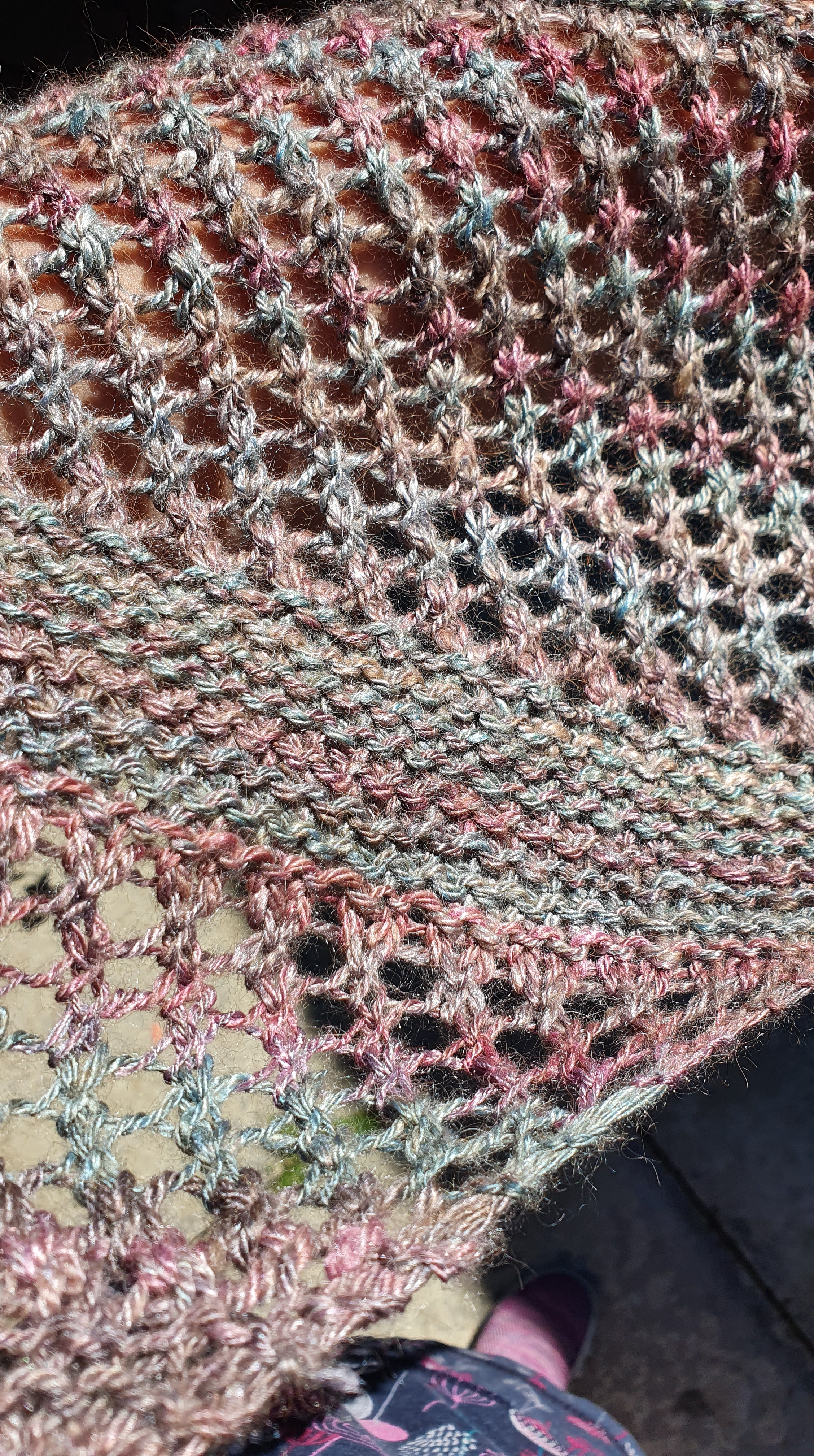 This pattern is quite easy to keep track of the eyelets once you have a few rows and can see they are all pointing in the same direction. The yarn was handspun by me and when I spun it and chain plied it I purposefully tried to keep the same colours together in sections to give stripes, but every now and then a next section of colour would sneak in.