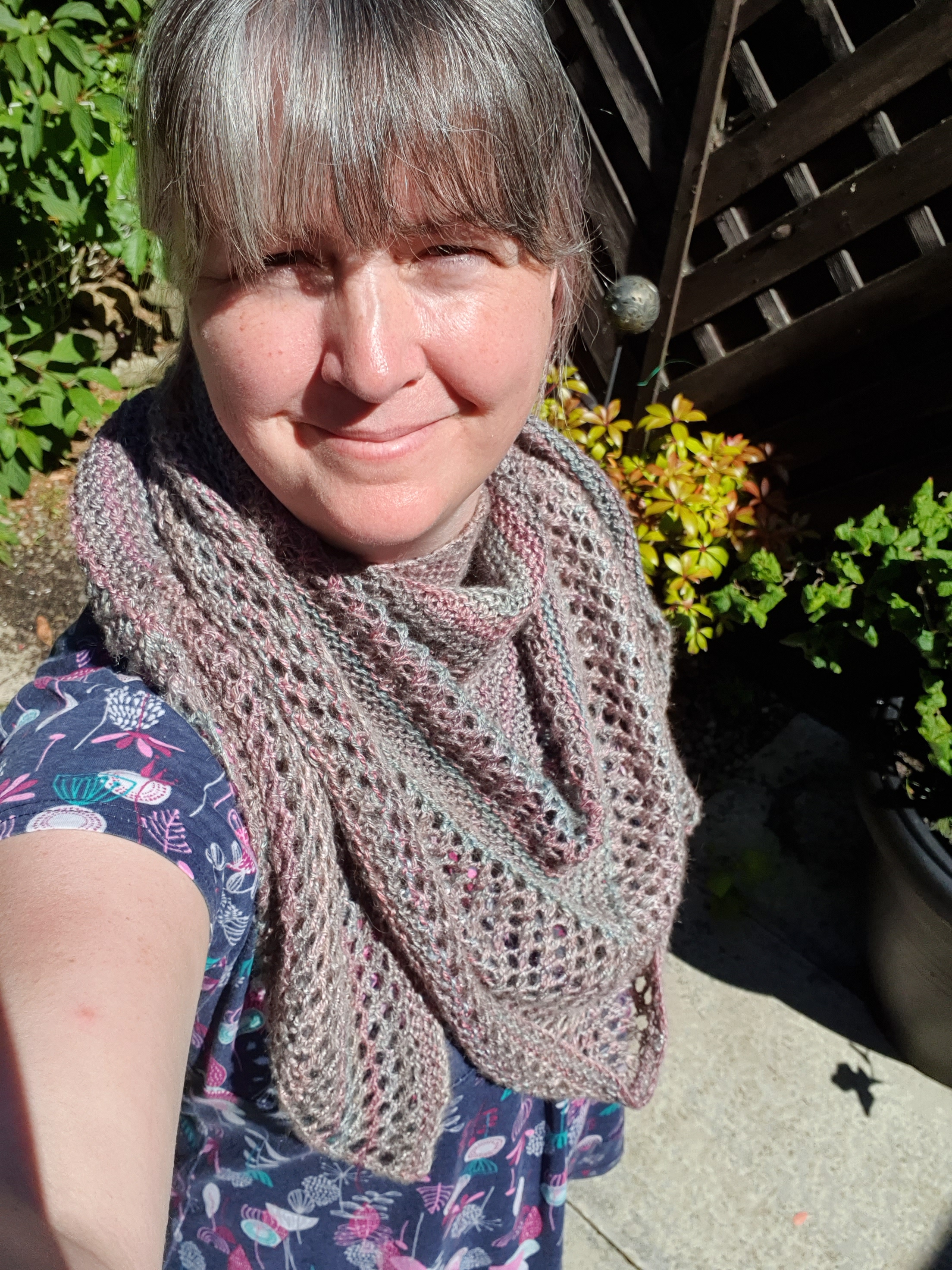 That’s beautiful, and it’s nice to see your smiling face! I knit a Reyna a couple of years ago and really enjoyed knitting it.