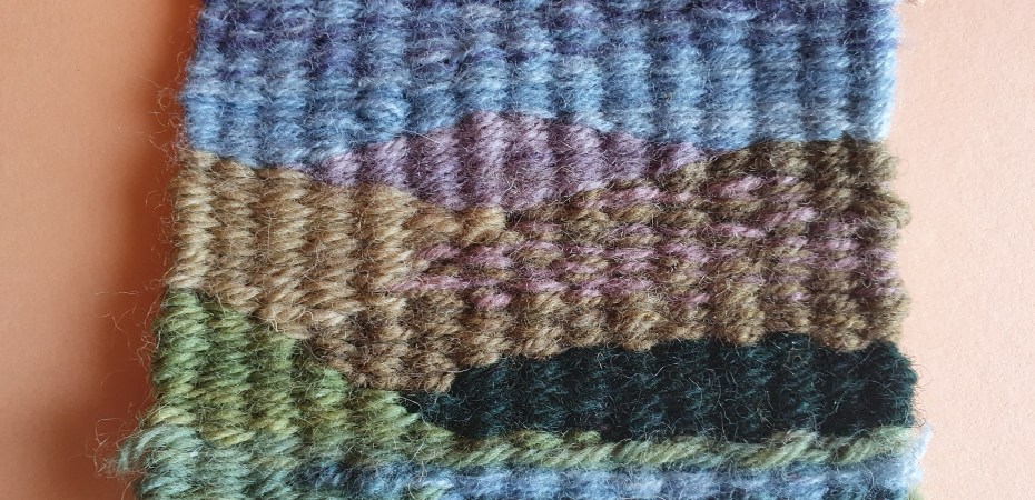 On the day I was going to warp my 32″ loom I put a Kelly Casanova weaving school video and randomly chose one on Tapestry weaving. Before I knew it I had warped a 3.5″ tiny frame and was giving it a go! The light isn’t great on the photo and the warp ends are a bit messy but it was just a first attempt.