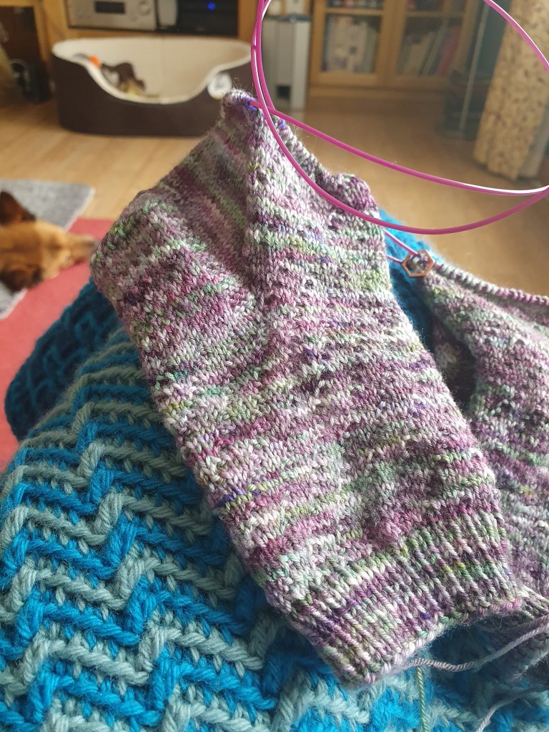 I’m on the foot of my socks now so they are mindless knitting now which is great for zoom calls.