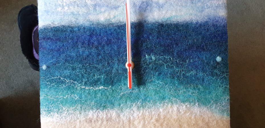 2. Freaking LOVE your clock. What a fantastic idea!! I’ve stopped putting up a clock above our pantry door because I’ve broken 3 – every time there is a time change I can’t seem to correctly hang it so it falls off. Maybe a felted clock wouldn’t break??? Your purple hat does look terrific on you. Glad you at least got to visit the beach even though it’s still cold. Love your “it’s a good price, etc.” rabbit hole for yarn buying. I have no more space yet I keep buying yarn!