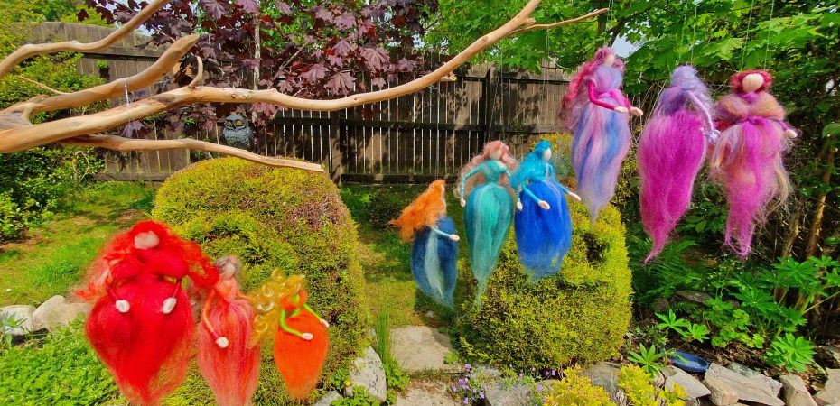 June is Pride month so it seems perfect timing for my rainbow of fairies to have been dropped off. I didn’t intentionally start making a rainbow but once I’d made some red, orange and green ones it seemed a shame not to continue the theme. (Where’s yellow? I don’t think I have ever made a yellow fairy! Hmm maybe my next herd of fairies will have yellow in.)