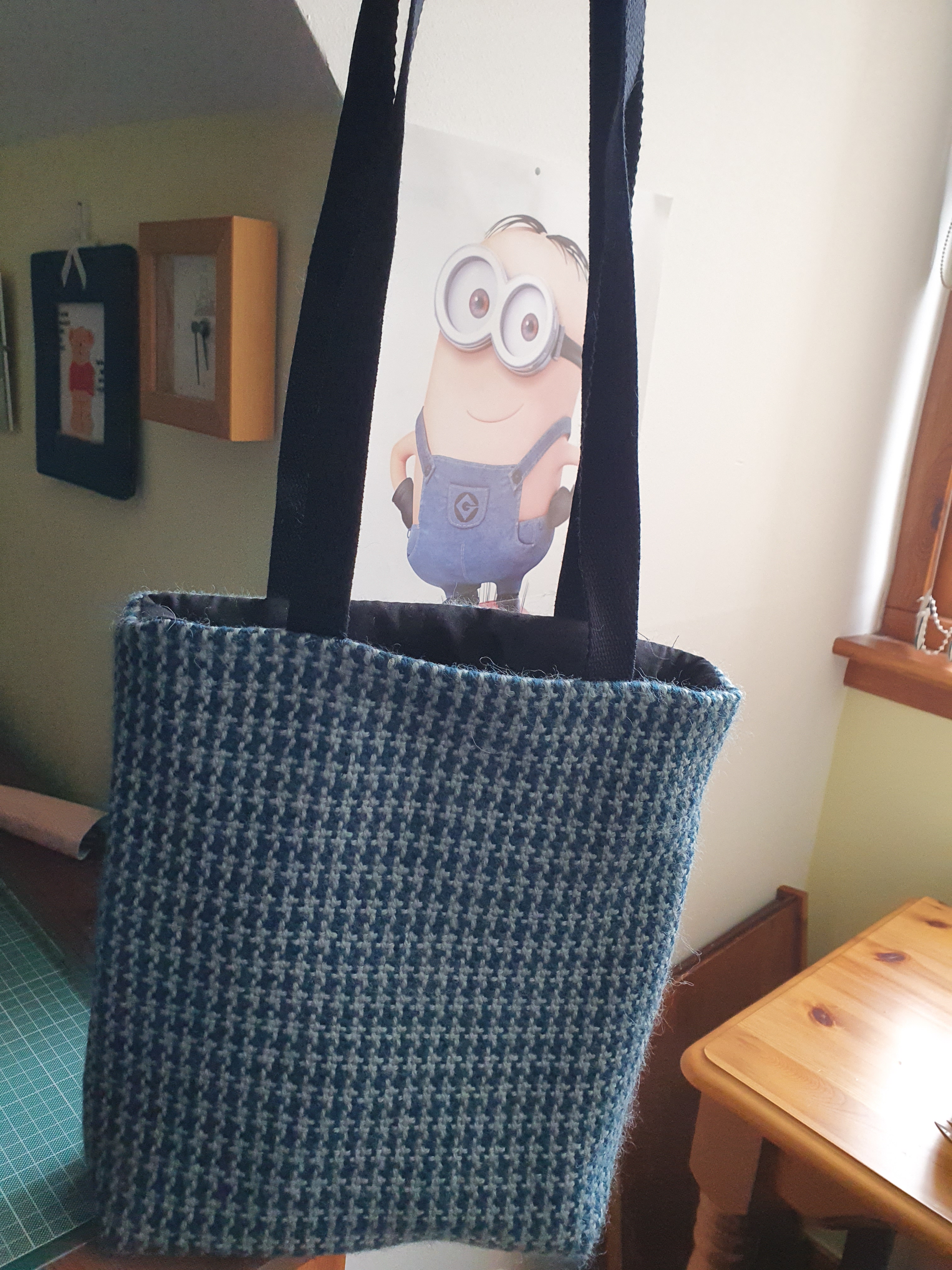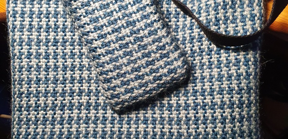 The pattern is very clear for both warping the houndstooth pattern on a rigid heddle loom (mine is 32″) and the sewing of the bag and lining. Lots of pictures and clear step by step instructions. I did get muddled when I put the lining on and ended up with it inside out and had to unpick and re-do, but think that was my error not the pattern.