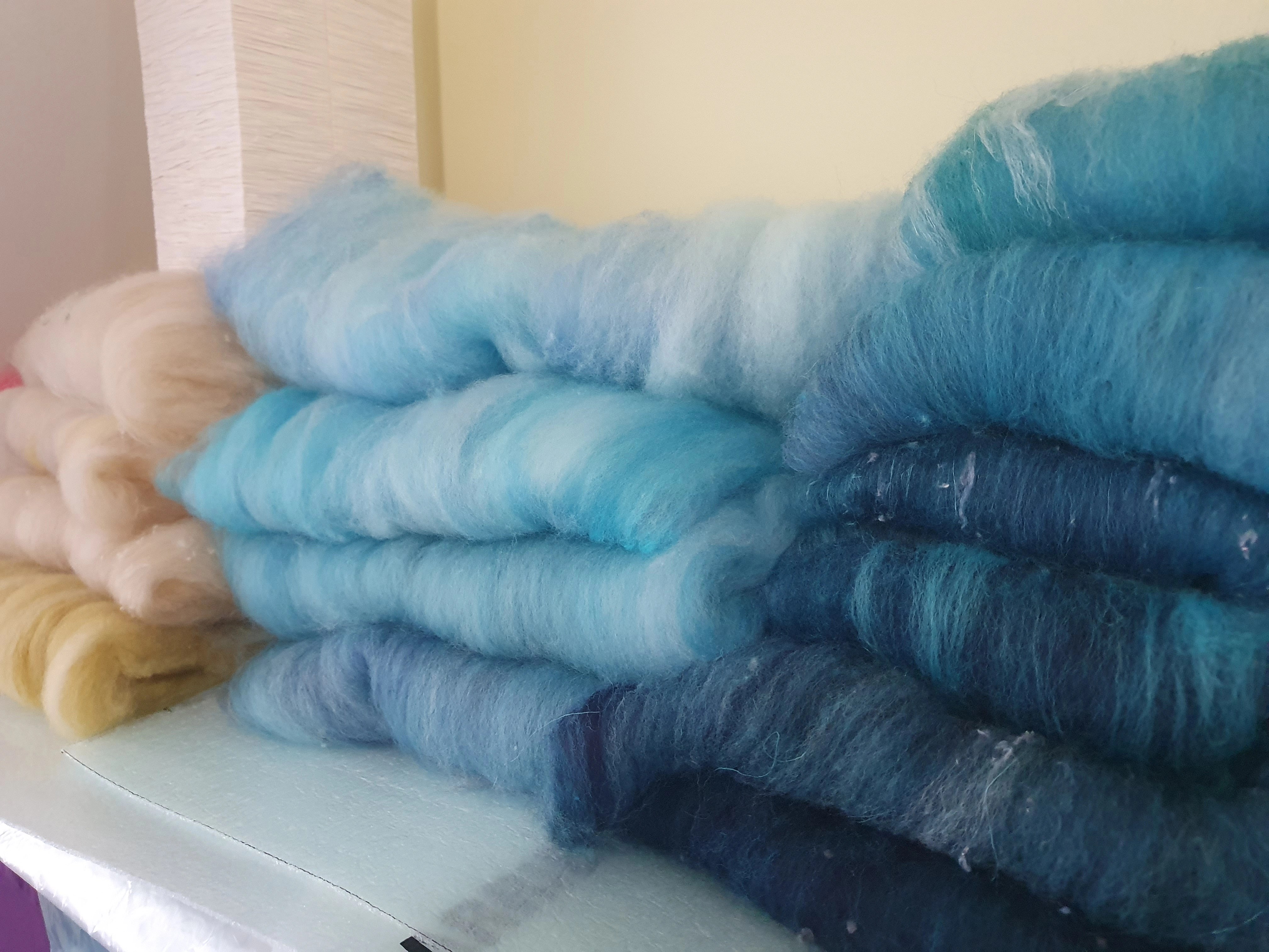 I carded lots and lots of batts for lampshades using a combination of hand dyed local wool and some commercial dyed wool. Here are some but I forgot to take a photo of the landscape green ones before storing them. The one on the carder is going to be for a Highland Cow lampshade.