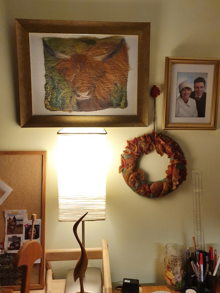 I also switched around some lamps and moved some pictures so the lamp really highlights my Highland Cow I felted a few years ago.
