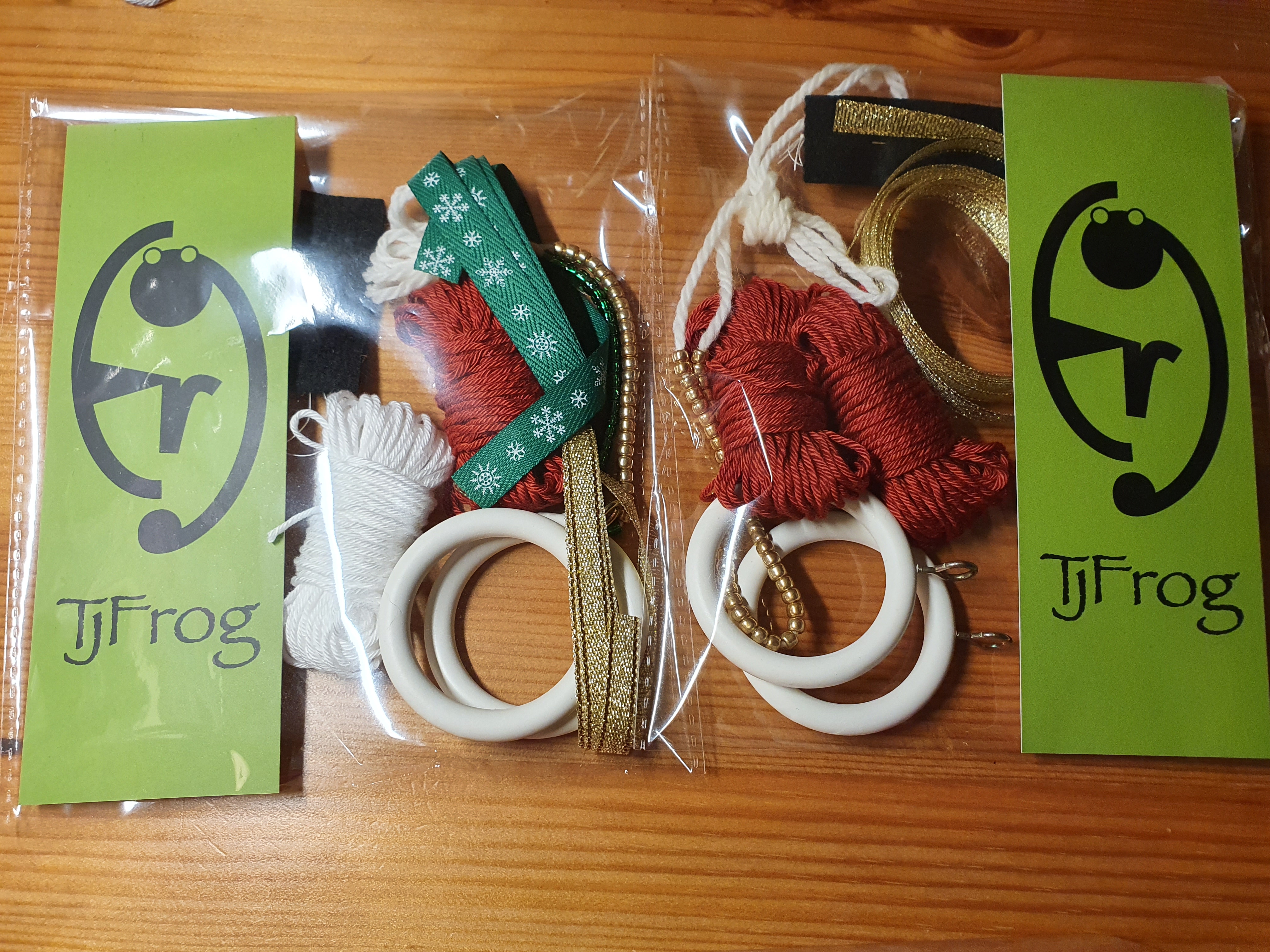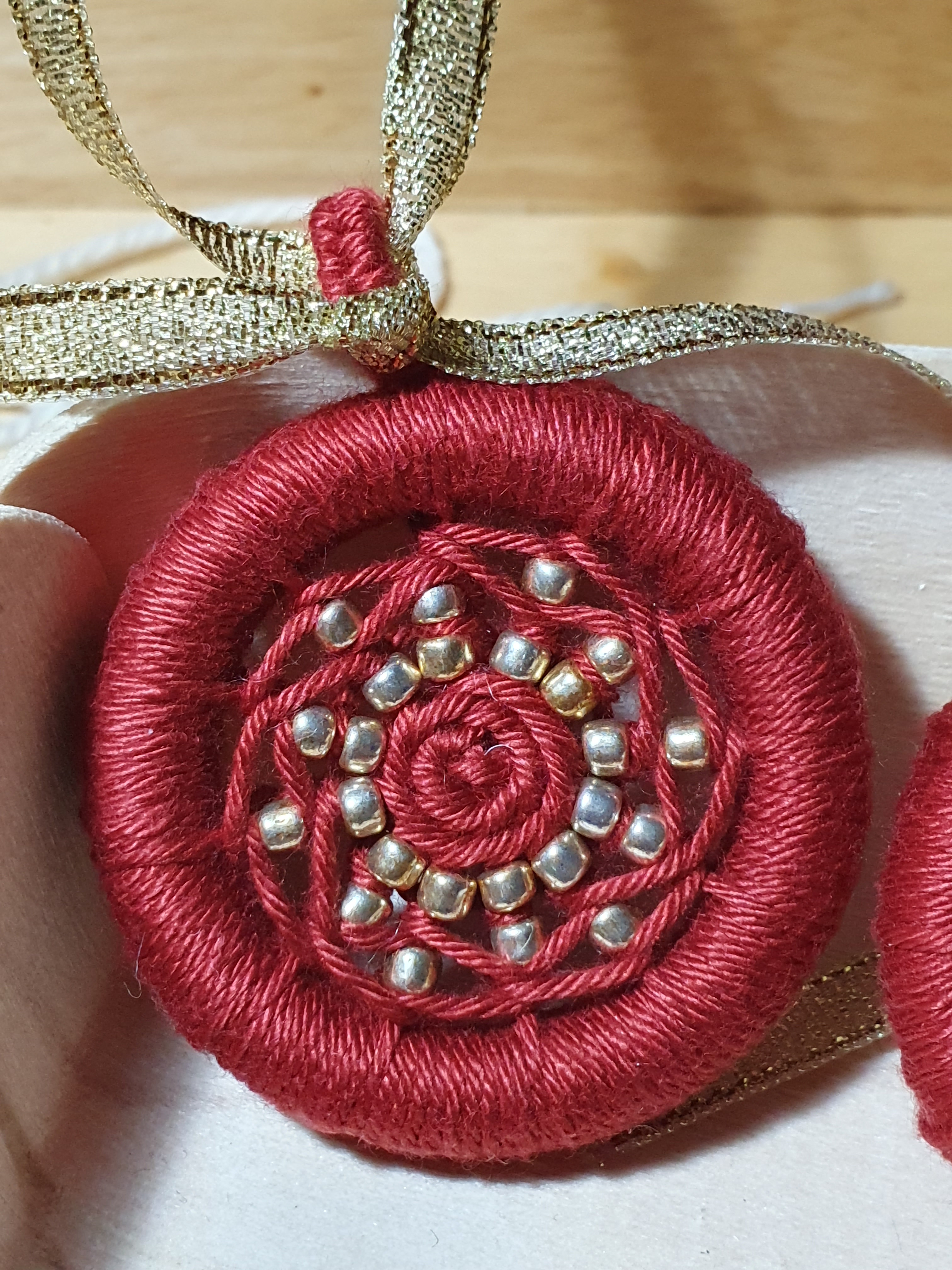 On Saturday’s Guild zoom meeting we learned how to make Dorset Buttons from Tania at TJ Frog. I had pre-ordered 2 kits (Red, white, green & gold and Red & gold).