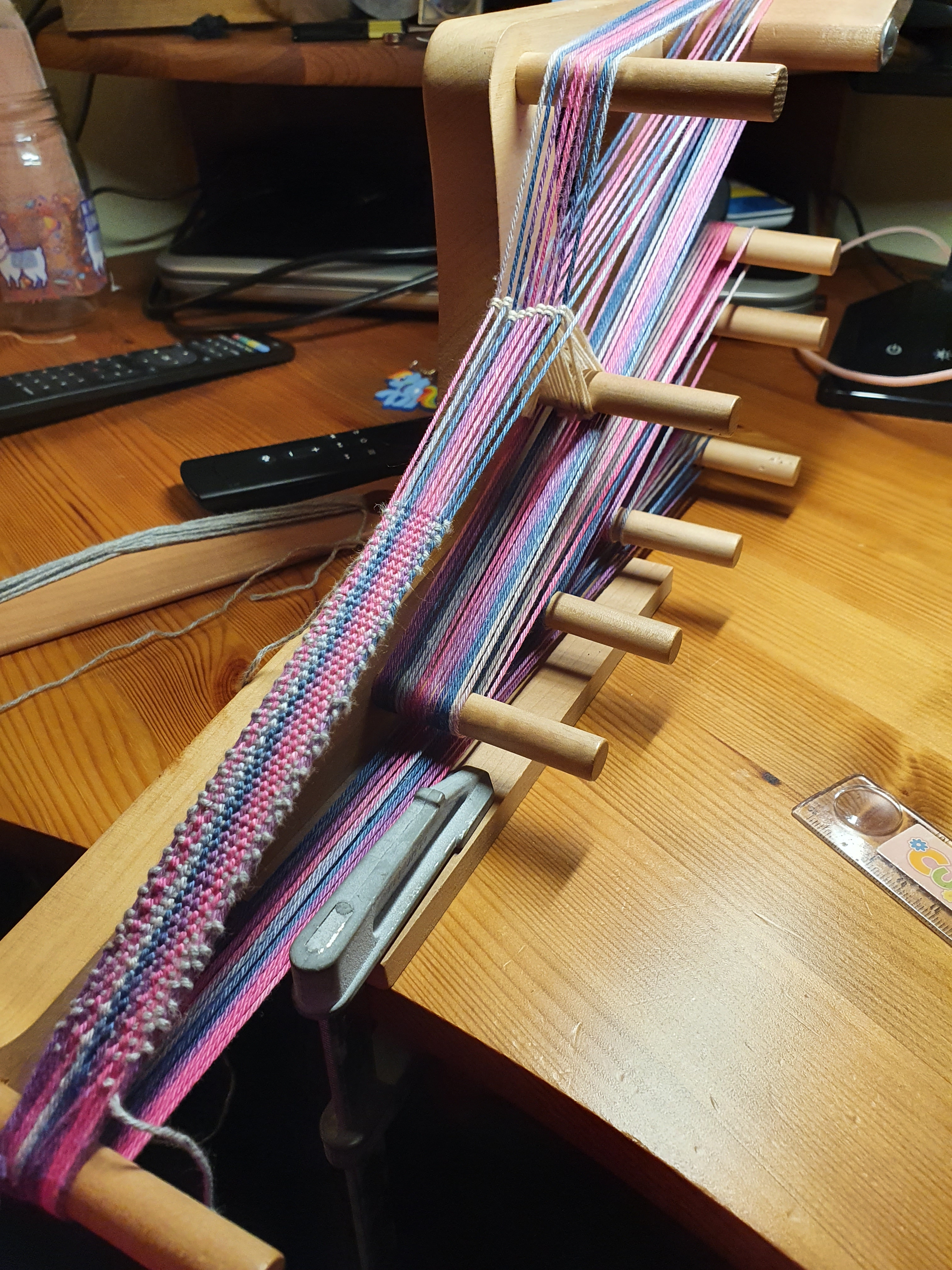 I am using some Sirdar Cotton Prints DK mercerised cotton for the warp and some Hobbii Rainbow 8/4 cotton in a grey I probably wouldn’t use for tea towels. You can do patterns but for this first attempt I’m just doing a plain weave whilst I get the hang of it. Still some improvement to make but I have plenty of length to practice.