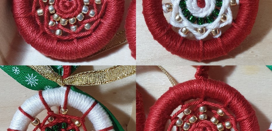 On Saturday’s Guild zoom meeting we learned how to make Dorset Buttons from Tania at TJ Frog. I had pre-ordered 2 kits (Red, white, green & gold and Red & gold).