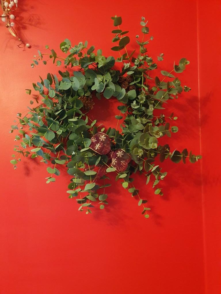 I made a wreath with some eucalyptus trimmings from the tree we had cut down that has been sprouting back to life.