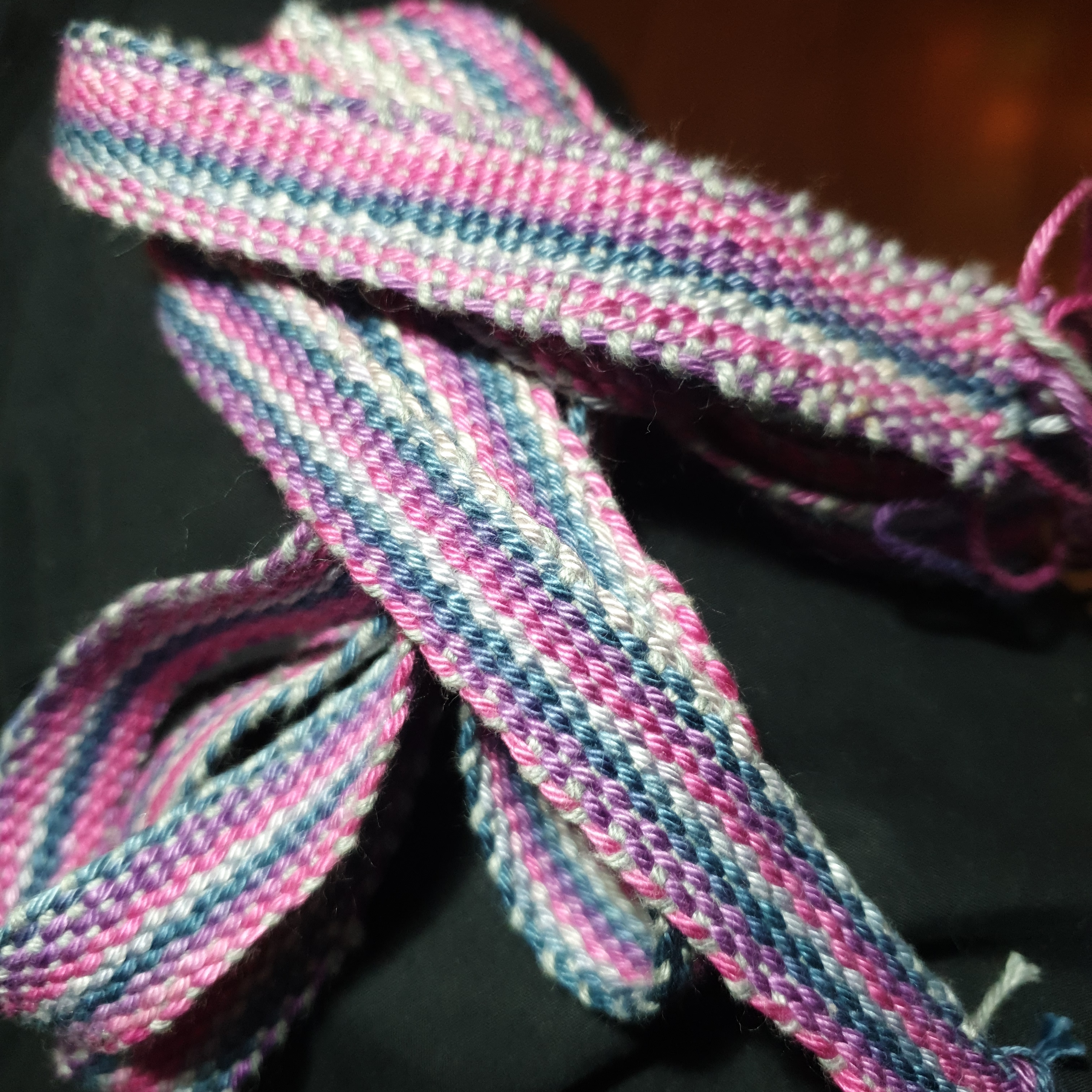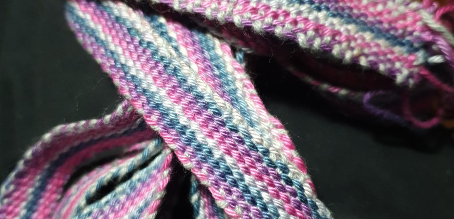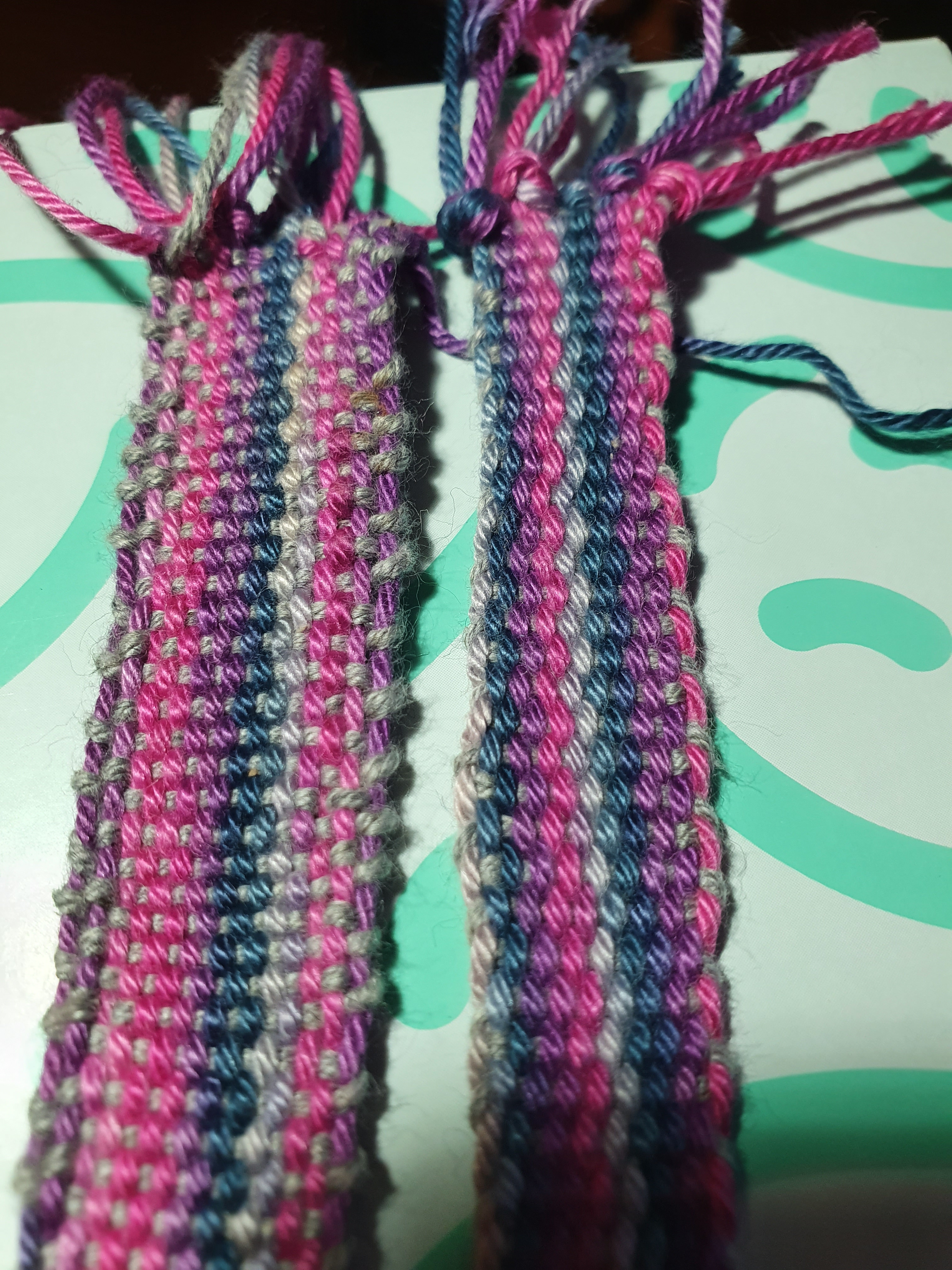 I finished my band on my Inklet loom. This is the first project and you can see on the left photo how much better I have got from the start (left) to the end of the band (right). It is a warp facing fabric so you shouldn’t see the grey weft. (This was 16 ends and is 1.5cm wide.)