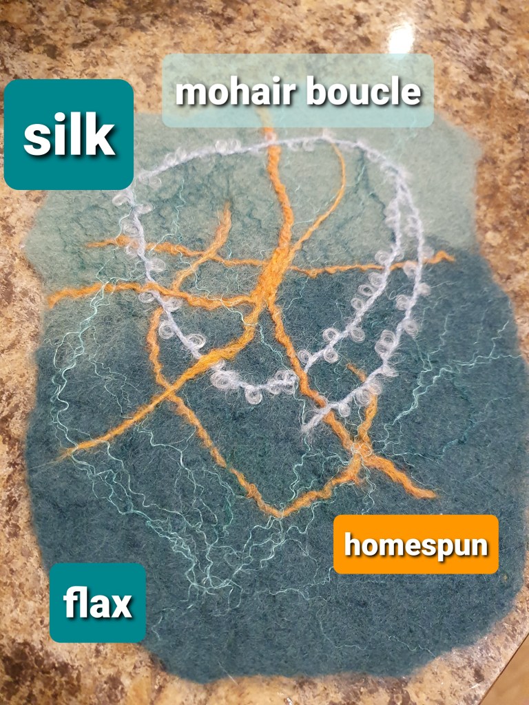I hate orange but it does pop against the greens. I think I like it better where Iโve split the ply so itโs thinner. I really like how the flax looks so will definitely add that and the boucle and have a think about the orange. The green silk isnt showing well, so doubt I will use that.