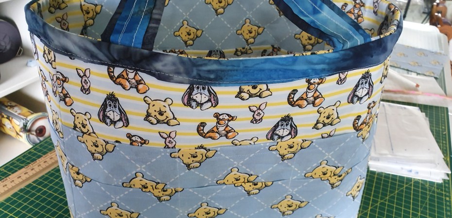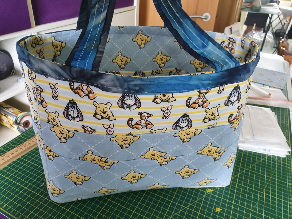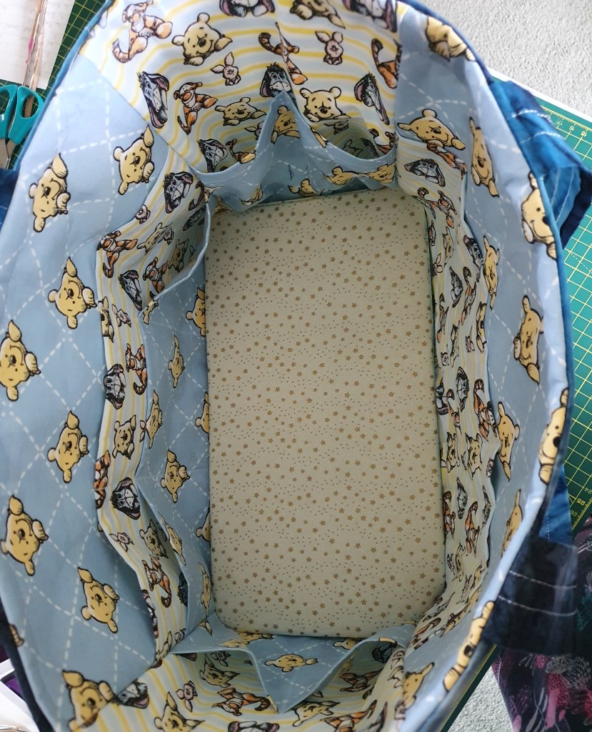 It said to use heavy interfacing so I ordered that and it is thick and stiff so that was a challenge to “bag out” (pull finished bag inside out so seams are hidden). It says to leave a small gap but in fact it needed a whole long side of the bottom open to manage to pull the bag through. Once it was bagged out it was this big stiff rectangle and you could do with a 2nd pair of hands to help push the lining down inside the bag…I used my head to get me started! I mean I literally treated it like a hat using my head to push the lining in!!