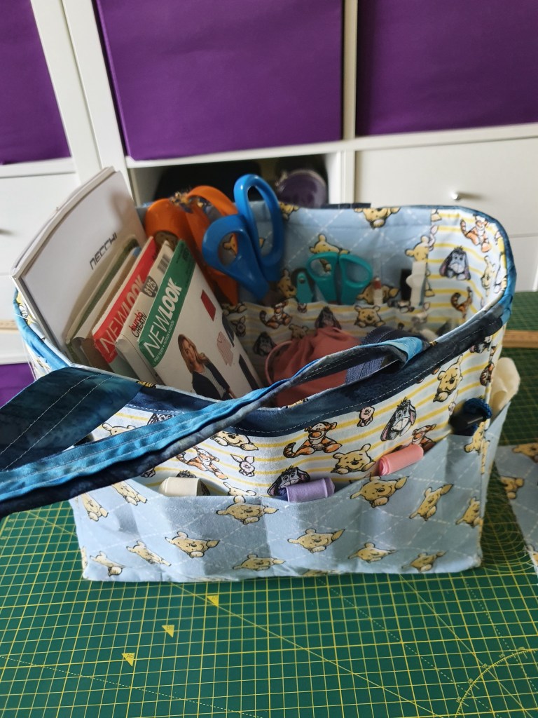 I think you could get away with a less thick and stiff interfacing, but it is great how it stands up and doesn’t sag at all so perhaps it is needed. Inside the base is a covered piece of cardboard so it’s sturdy. On the pattern photos it has knitting needles and crochet hooks showing, and I could see it would be good for storing many different themed crafting supplies or even drawing supplies.