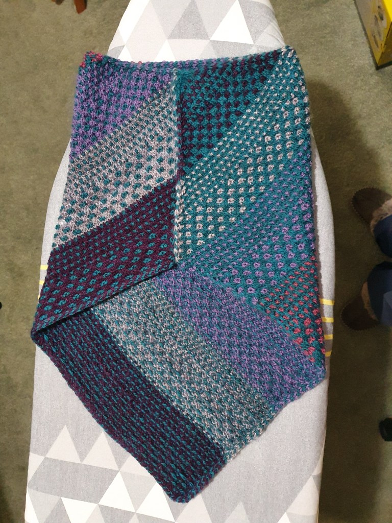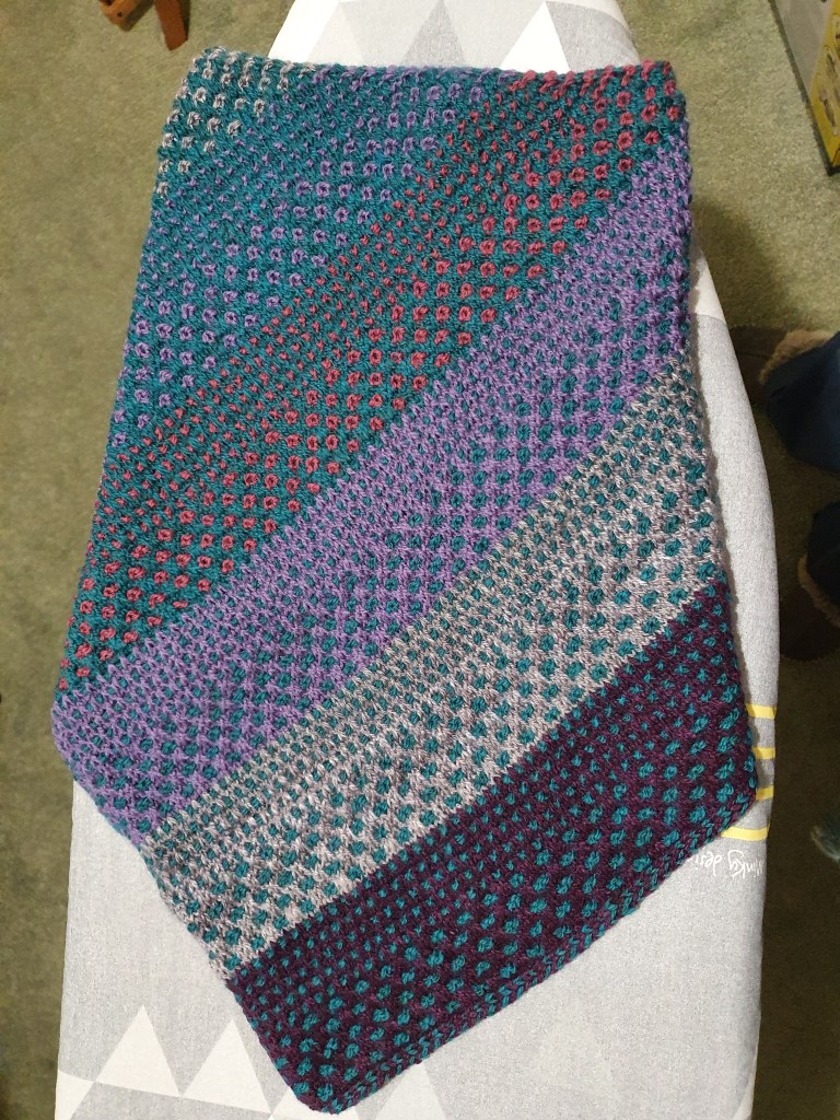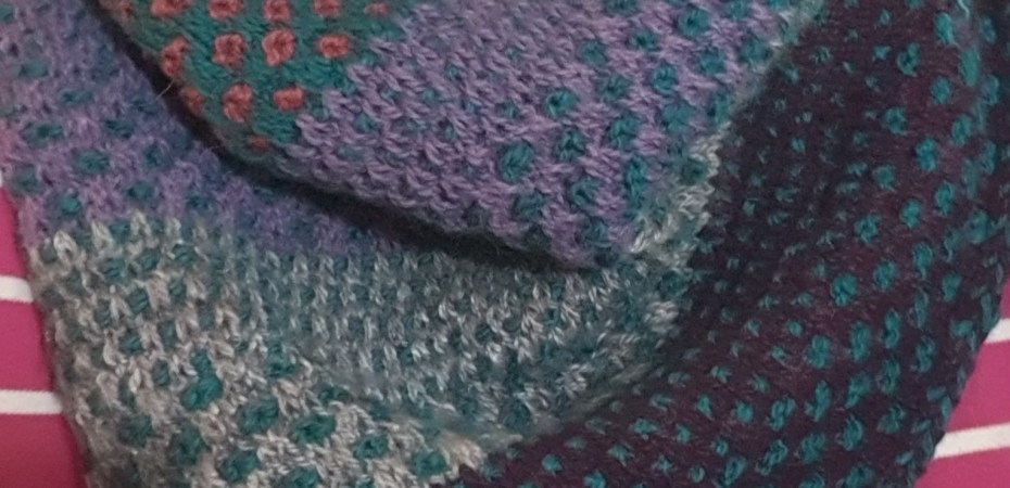 I have finished my The Shift cowl by Andrea Mowry. I changed the colour order that she specifies, so that I kept my own teal handspun Falkland merino throughout the whole project. On half it is the background colour and the other it’s the bobbly bits. I also reversed the colour order of sections 1 – 3 for sections 5-7. Personally I much prefer it to her original. In real life the dark purple isn’t so dark.