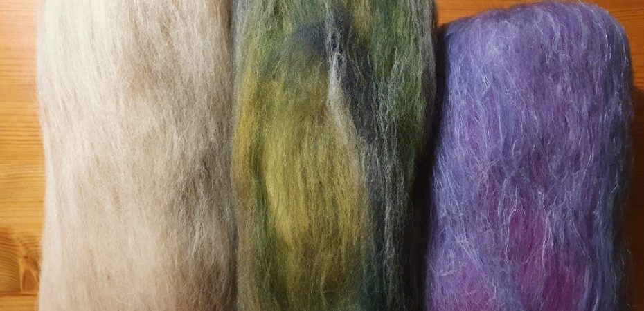 I also made up a purple blend with merino and some lilac flax. I’m not sure yet what I’ll do with it. I may just do a felt square and see how it looks. In autumn here the hills turn purple with the heather and I’d like to see how it looks felted before I try it on a lampshade.
