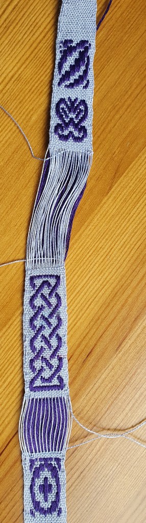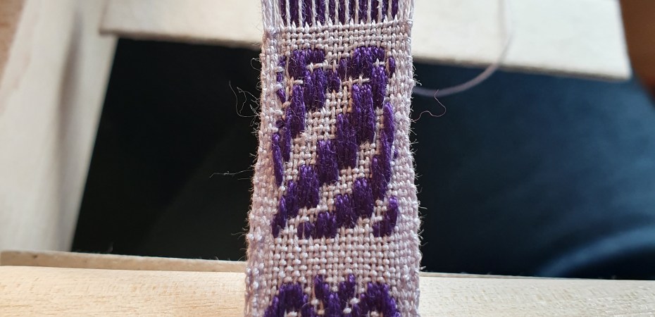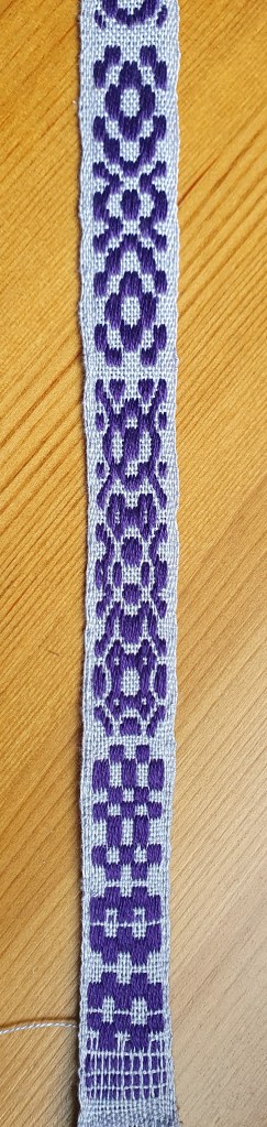 After a long time ignoring my Inkle loom, I spent some time on it this week to do some more of the Monk’s Belt patterns from the pattern directory book. (Monk’s belt pattern is done with 2 different thicknesses of threads, the thicker threads making the pattern and the thinner the background.) It’s so tricky with such fine threads and not really enjoyable so I’ve now cut it off and will do a project with thicker yarns to make a different type of band.