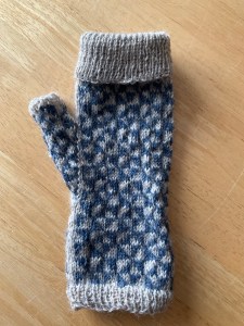I have finished the first of the Pinwheel fingerless mittens. It will look better once it’s blocked. I have a slight concern about making its buddy for my left hand, as with all the carried yarns at the back it may catch on my rings and watch. This hasn’t been an issue with my DK colourwork mittens but with these using lace yarn it will be easier to snag and tear a thread. Does anyone have any advice?