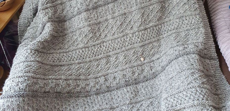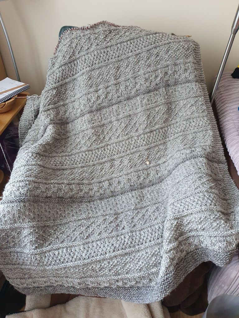 I’ve only been working on my Gansey blanket the last couple of weeks.  It is progressing well and I am on the last (6th) ball of the light grey and have the remainder of the 1 ball of darker grey.  I drafted a chart for a personalised section which had my initials and the year, knitted it after the photo below was taken, but it’s just not legible so I’ll be unpicking that and just sticking to the pattern. The yarn is Isle of Auskerry North Ronaldsay Wool from Orkney’s seaweed-eating sheep.