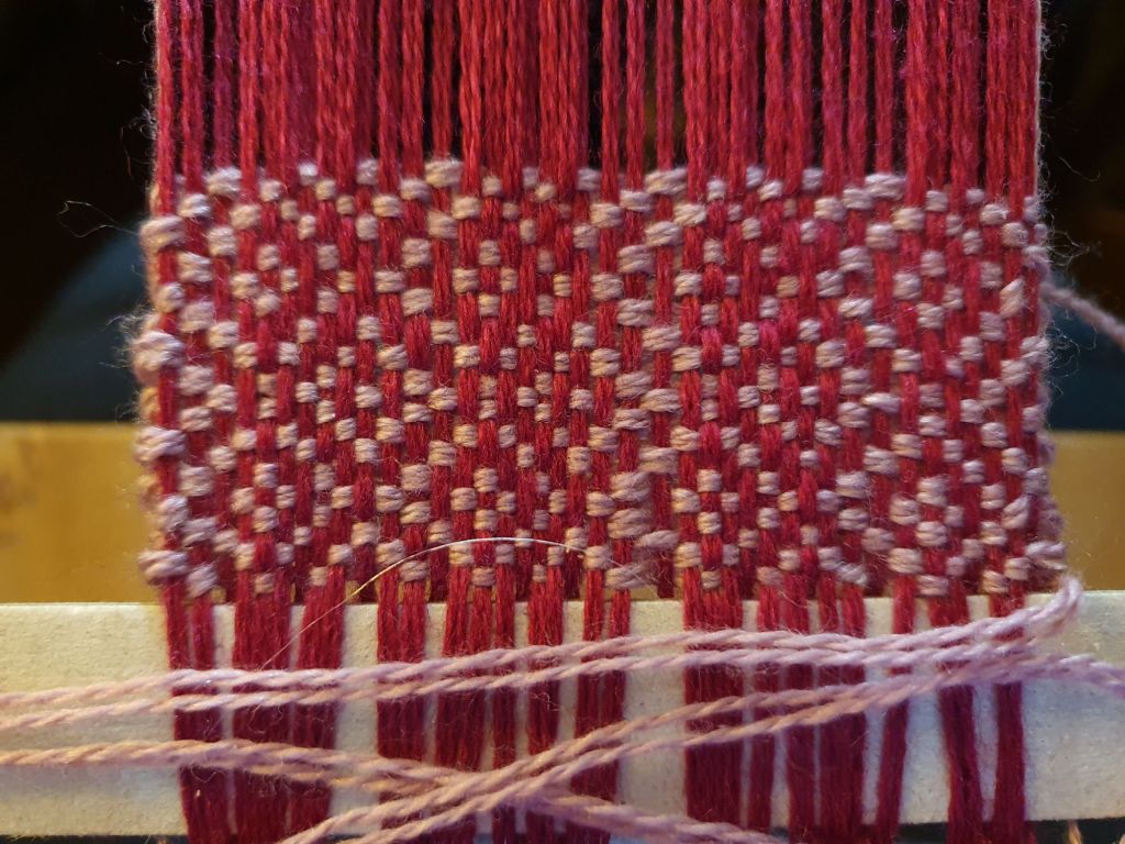 I’ve started a sample of the Diamond Stripe towel pattern but using some West Yorkshire Spinners Exquisite Lace yarn (80% Falkland merino/20% silk).  I’m using two 12.5 dpi heddles on my 10″ loom and so far it seems to be going well.  It’s only a small amount as I wanted to check it was going to be okay, it may be enough to make a headband.