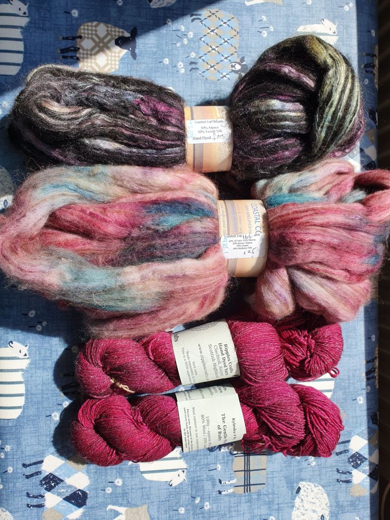 Two of my favourite dyers were at a local wool fayre.  How would I resist…well I couldn’t.   Especially as I’d finished spinning all my fibre from Coastal Colours and Helen at Ripples Crafts has a new yarn base to try.  My plan was not to buy pink or purple…oops