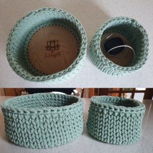 - โ Bowl and plant pot cover kit (included base and Bobbiny cotton rope yarn). Started week 5, finished week 6.