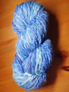 - โ Selfish Pullover by Sweater Freak in New Lanark Chunky yarn in Denim/Sky. Started week 1, finished week 5. Neck adjusted week 20.