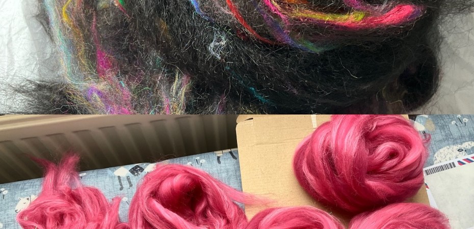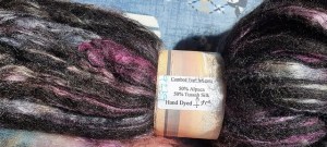 On our spinning interest call I used my hackle to blend two colours of merino with some pink bamboo and a few white sparkles. Then I did black Suri alpaca with sari silk, it’s a bit patchy because sari silk is so short and suri alpaca so long.