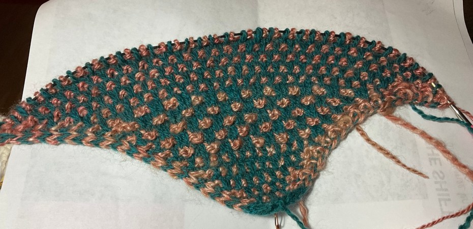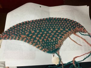 I have started a 2nd The Shift cowl using handspun. The background green (which is also in my 1st Shift) is Falkland merino from John Arbon. The peach and peachy pink are a bit similar really but I’m going with it for this section, it’s baby camel and silk advent colours.