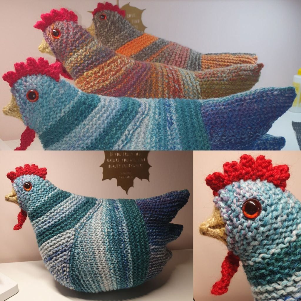 Last Christmas our Guild had a gift swap. I hadn’t got organised enough to make something and my friend Hilma was one who didn’t receive anything. So when she was admiring my 2nd chicken on a Zoom call, and mentioned she’d like one, I offered to make one for her. She likes turquoise and teal so I pulled out some appropriate handspun. Rambouillet fibre I bought in Wisconsin and Shetland fibre I dyed dark green. I love this chicken and I’m going to see if I have enough yarn to make another. I may spare you seeing that one as it will be so similar you really will think deja vu then.
