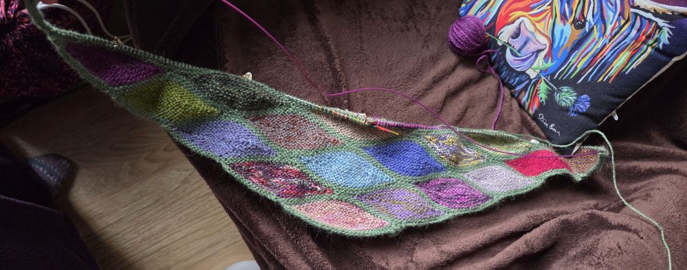 Last week there was some interest in this pattern and I’d recommend it. In case I forgot to mention last week, I am using German Short Rows rather than wrap and turns. (If you buy this pattern and want to do GSRs too, remember to knit 1 extra stitch before doing the GSR/double stitch.) I’ve excluding some advent colours so I’m just starting to repeat colours now.
