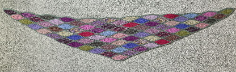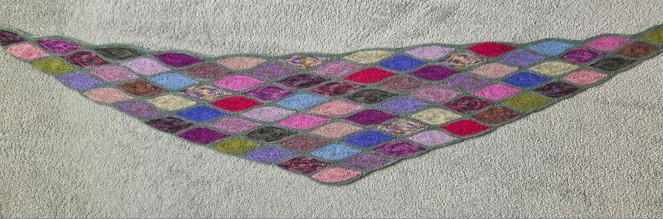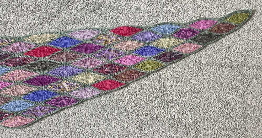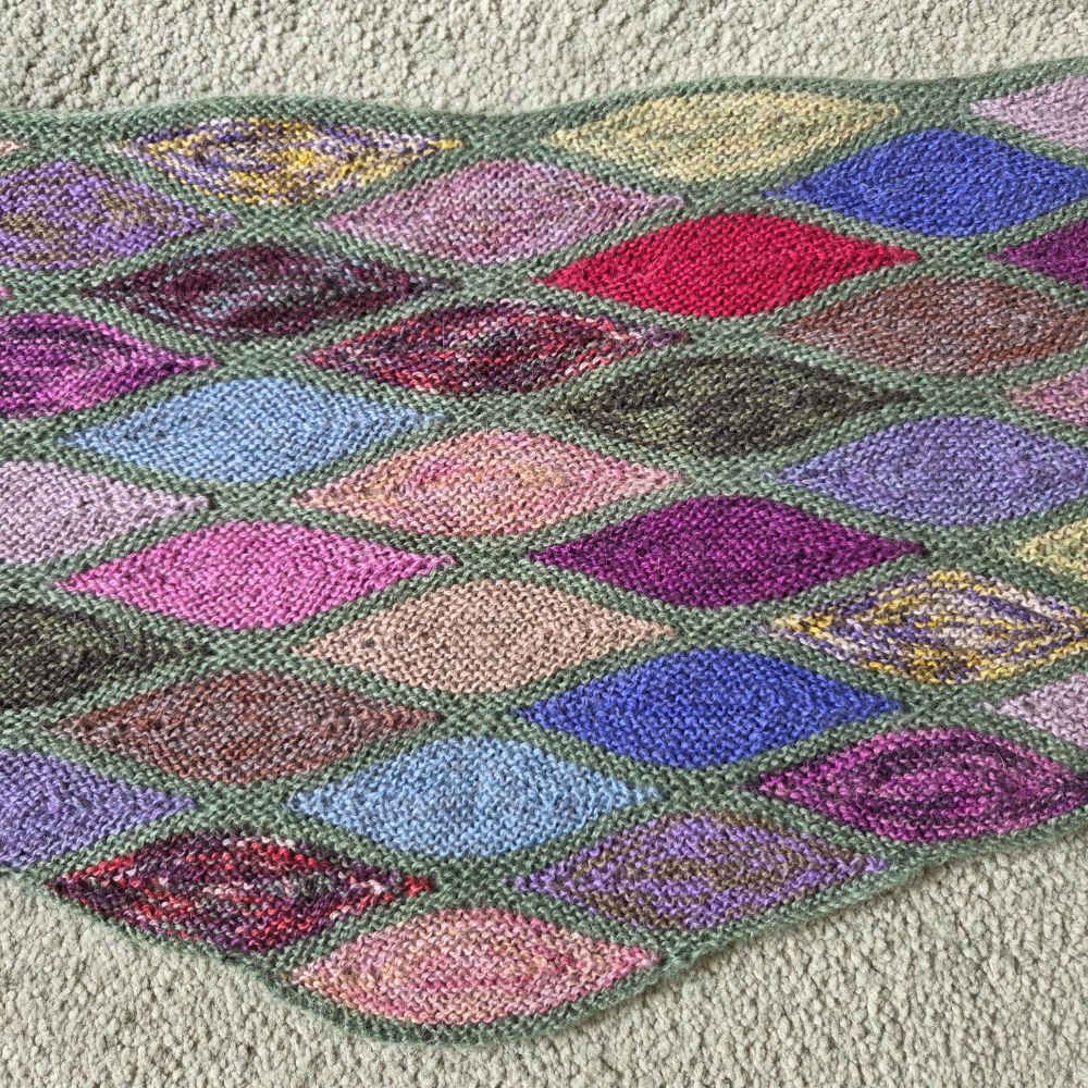 When you have finished a gemstone both ends of that yarn are together, right next to where you are going to use your background colour to go across the top. So you can easily weave them in by wrapping both ends (at the same time) around the background colour as you knit across the top of that gemstone. (Gosh I hope this is making sense). It’s so easy to do and it means at the end of the project I only had 2 ends to sew in!! This is pretty impressive when there are 78 gemstones and so you could be sewing in 156+2=158 ends.