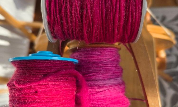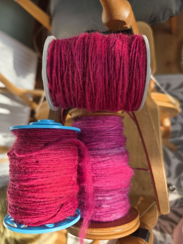 I spun with some friends and managed to fill 2 bobbins of my Nano wheel with some unknown top from a friend, a slightly different shade of pink.  It will also go in the chicken.
